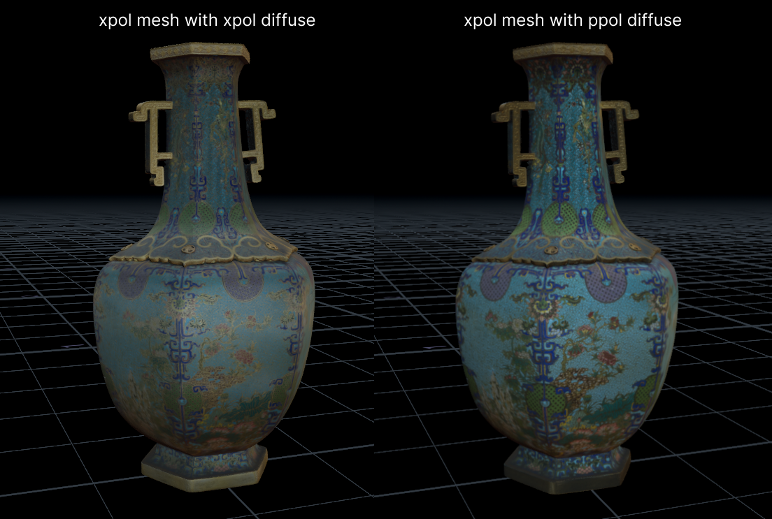 Previously, our main challenge was transferring PPOL diffuse maps onto the XPOL mesh. Because the XPOL and PPOL outputs from RealityScan are generated as two separate processed meshes, they don’t share: